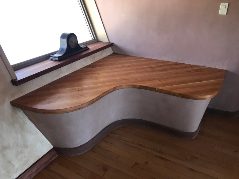 CURVED CHERRY TOP with natural oil finish over clay plastered sitting nook top create a interesting usable element within the home.