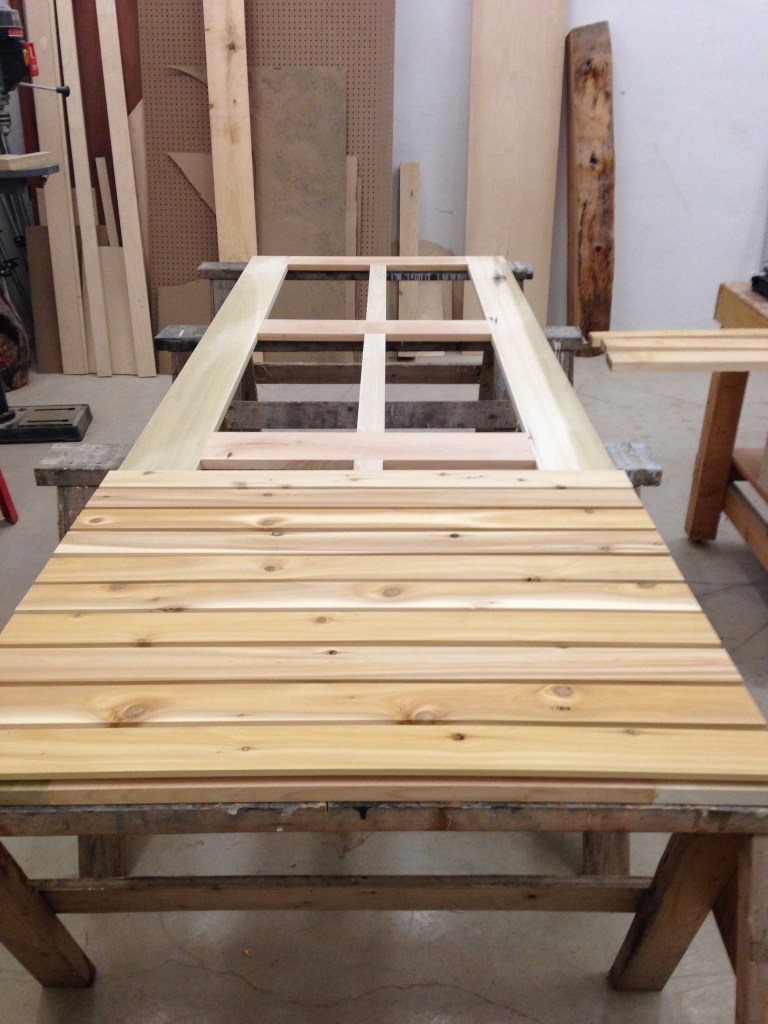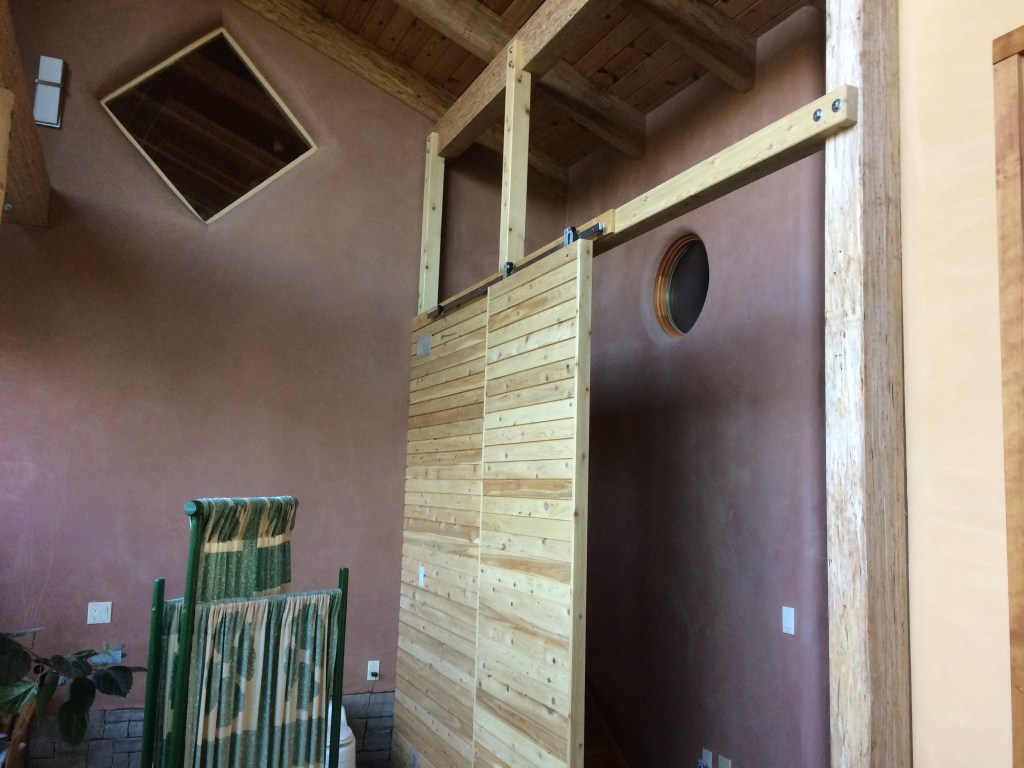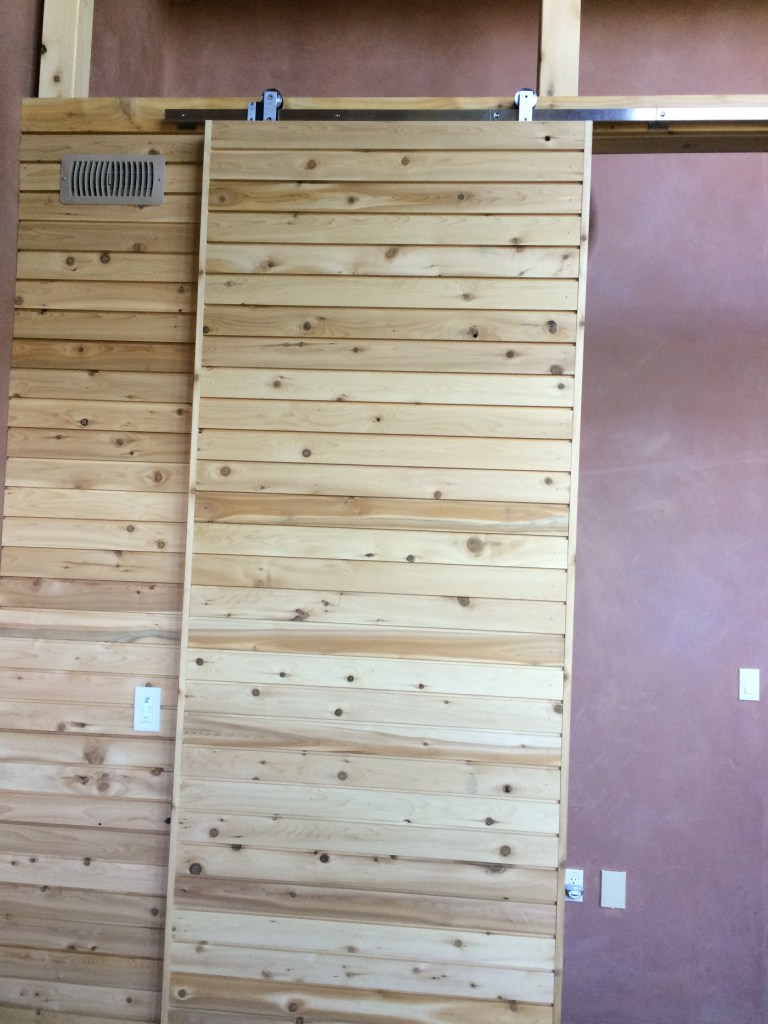 Sliding wall Cedar sided sliding wall that closes off a space keeping the look of a high enclosed wall structure.